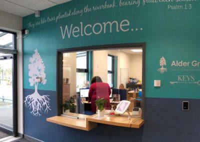 Alder Grove Church of England School asked us to create a new entrance area using their branding and displaying their logo and the Key Academy Trust logo. We covered the whole reception wall, giving it a professional and welcoming feeling when you walk built on a firm foundation of Christian values.